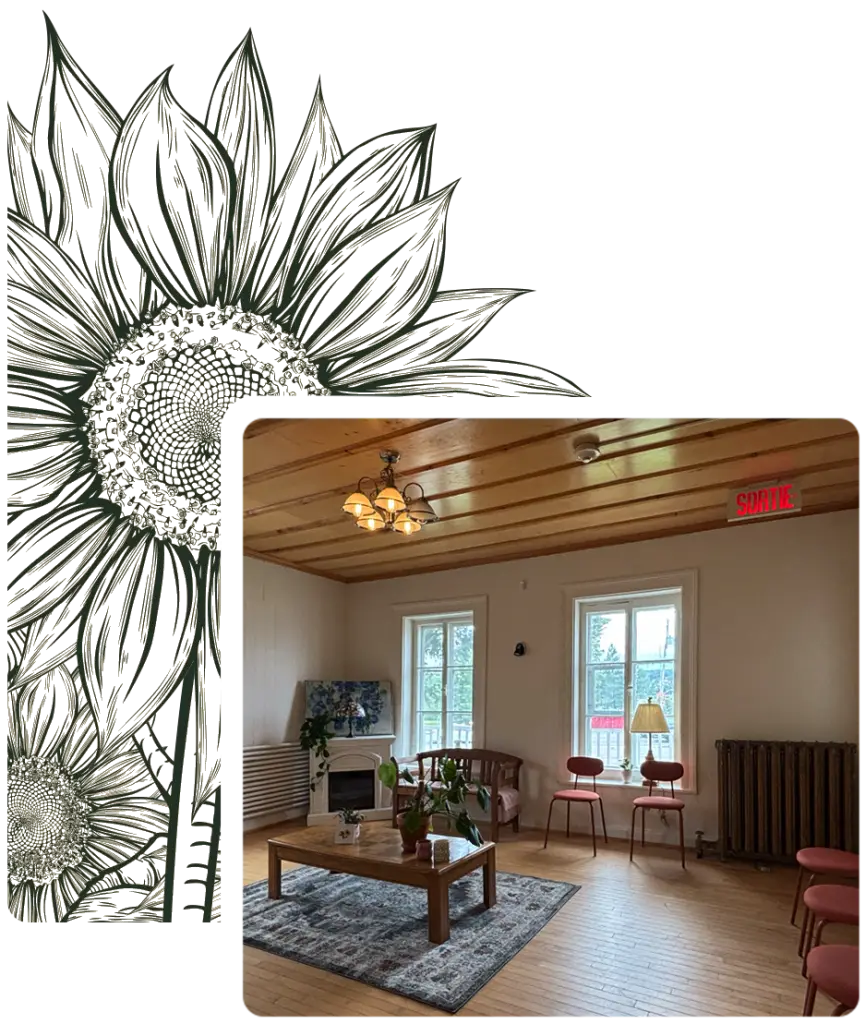 Le tournesol est une fleur emblématique qui symbolise la croissance personnelle. À l’image du tournesol qui se tourne vers la lumière pour grandir, chaque client·e est accompagné·e dans son cheminement vers le mieux-être, au moyen d’un espace sécuritaire où il est possible de s’épanouir, ou de fleurir, à son rythme.